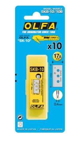 Kvalitní náhradní vyměnitelné čepele OLFA se třemi otvory. Určené pro bezpečnostní řezač SK-10. Vyznačení 4 řezacích poloh čepele. Baleno v plastovém bezpečnostním boxu v blistru po 10 ks.