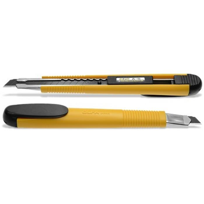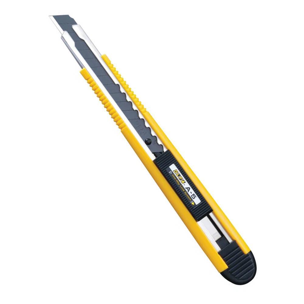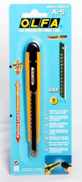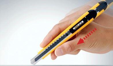 Řezač s jednosměrným blokováním čepele pro rychlé vysouvání s 9 mm odlamovací čepelí. Opatřený plochou pojistkou pro aretaci a posun čepele. K dispozici plastová spona pro zavěšení a odlamování. Instalovaná čepel: AB Rozměry : 150x20x15 mm Nůž je vybaven součástí pro odlamování segmentů.