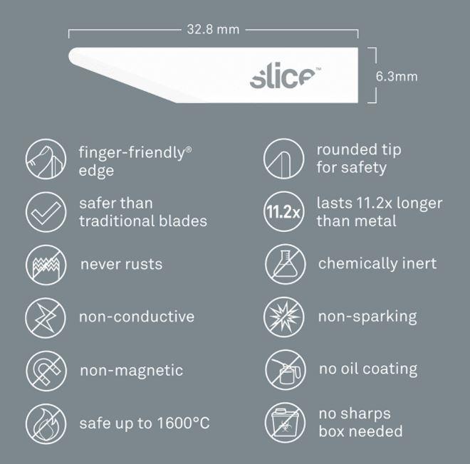 4 ks jedno-stranných čepelí se zaoblenými špičkami a rovnou hranou. Bezpečnější díky Finger-friendly hraně než klasické kovové čepele. Poskytují 11,2x delší dobu používaní než ocel. Odolnost teplotě od -40 až 1600 °C. Bezpečnostní čepele SLICE jsou chemicky netečné, nemagnetické, nevodivé, nejiskřivé, nerezavějící bez potřeby mazání. Na výměnu čepelí nejsou nutné žádné nástroje. Kompatibilní nože: 10548, 10589, 10580, 10568 Rozměry: 32,8x6,3x0,5mm