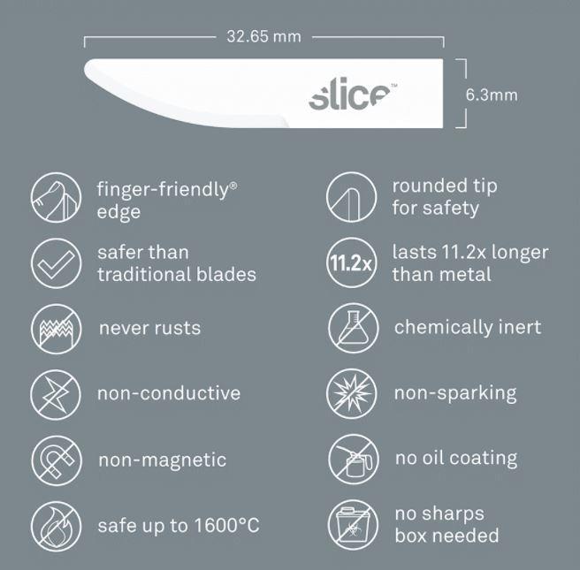 Bezpečnostní čepele SLICE jsou chemicky netečné, nemagnetické, nevodivé, nejiskřivé, nerezavějící bez potřeby mazání.