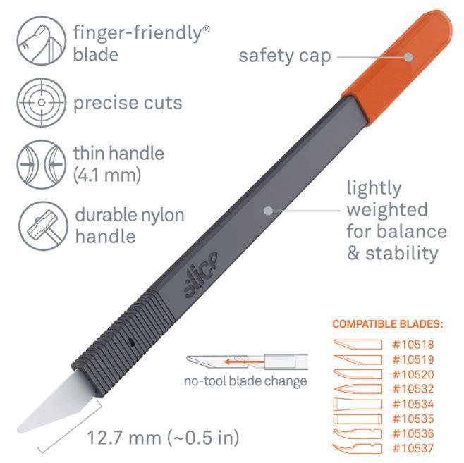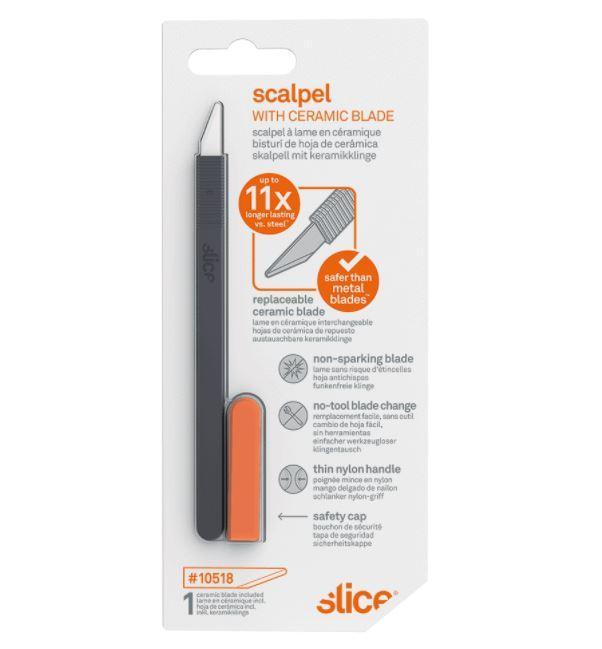 Keramický skalpel SKU 10568 s možností vymění čepele kombinuje nejlepší vlastnosti skalpelu SKU 10574 a řemeslného nože SKU 10548. Bezpečnější díky Finger-friendly hraně než klasické kovové čepele, poskytující 11,2x delší dobu používaní než ocel a odolnost teplotě od -40 až 1600 °C. Bezpečnostní čepele SLICE jsou chemicky netečné, nemagnetické, nevodivé, nejiskřivé, nerezavějící bez potřeby mazání. Na výměnu čepelí nejsou nutné žádné nástroje. Jeho tenká, plochá rukojeť (pouze 4,1 mm tlustá bez krytky) Vám umožní pracovat s nejvýší přesností. Rukojeť je vyvážena pro rovnováhu a stabilitu. Vhodný pro praváky i leváky. Kompatibilní čepele: 10518, 10519, 10520, 10532, 10534, 10535, 10536, 10537 Rozměry: 140x10x5,8 mm Váha 6,4g