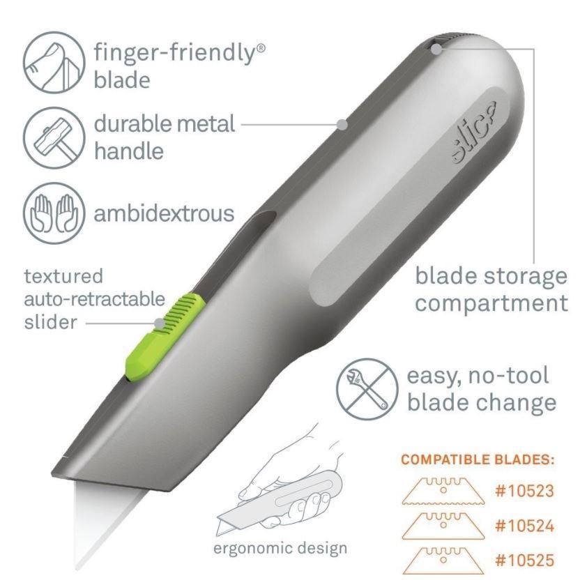 Kombinuje elegantní, ale robustní kovovou rukojeť s patentovanou bezpečnostní čepelí Slice pro výkonný a bezpečný nástroj.