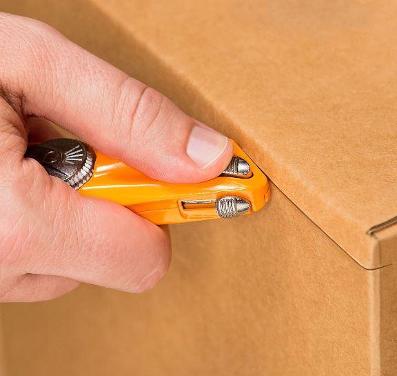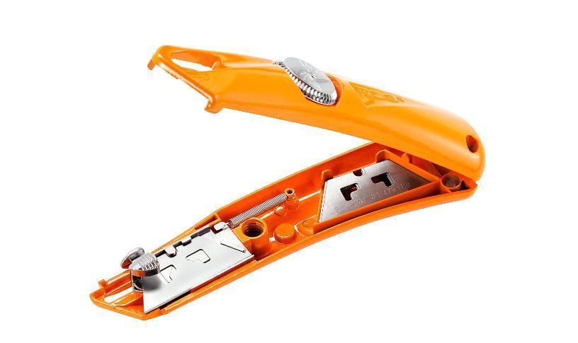 Kovový 3tlačítkový samozasouvací nůž PHC RZ3 s instalovanou trapézovou čepelí SP-017. Tělo nože z poniklovaného kovu. Nůž je vybaven třemi tlačítky pro řezání pravou i levou rukou. Automatické ovládání čepele pružinou. Otvor pro zavěšení. Rychlá výměna čepele bez pomoci dalšího nástroje. Určen pro bezpečné otevírání obalů a řezání materiálů. Pojme dalších 5 čepelí. Kvůli své váze je tento nůž vhodný především pro může. Povrchová úprava - lak. Výměna čepele Otočte kruhovým ovladačem proti směru hodinových ručiček - tím otevřete bezpečnostní nůž. Vyjměte použitou čepelku a na její místo vložte novou. Nůž zavřete a zajistěte otočením kruhového tlačítka po směru hodinových ručiček.