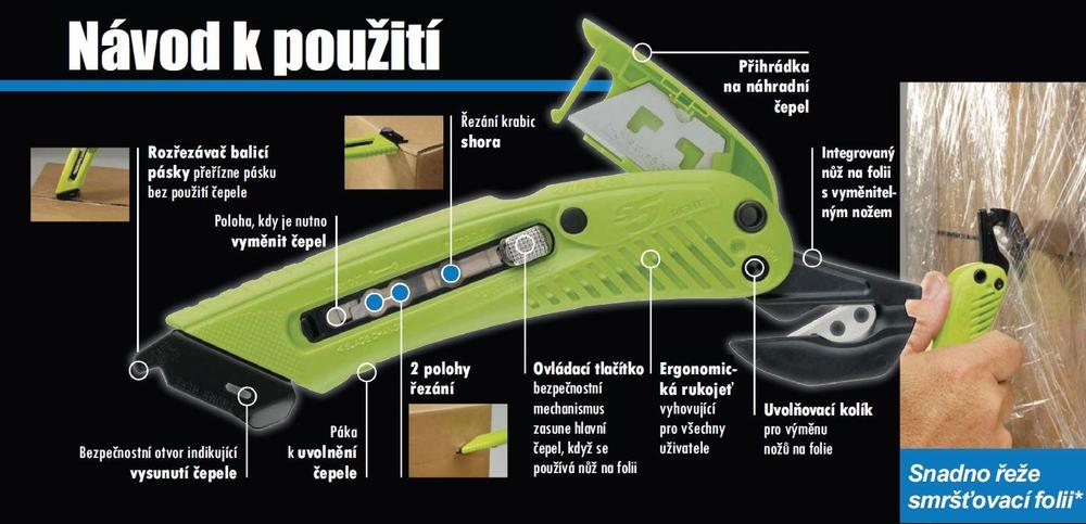 Bezpečnostní nůž PHC S5L 3v1 s instalovanou trapézovou čepelí SP-017. Je velmi oblíbený mezi uživateli z důvodu jeho mnohostranného využití. Vyroben z plastu. Pevný ocelový ochranný kryt, který slouží také jako vodítko pro dokonalý řez. Pojme dalších 5 čepelí, které pak máte ihned po ruce. Nůž má rozřezávač balicí pásky, který pracuje bez použití čepele. Integrovaný nůž na fólii s vyměnitelným nožem. Umožňuje bezpečné, snadné a pohodlné řezání. Unikátní úhel čepele, aby nedošlo k poškození obsahu uvnitř krabice. 3 polohy hloubky čepele - horní řez, mělký řez a hluboký řez. Výměna čepele bez nářadí. Výměna čepele Dejte ovládací tlačítko co nejvíce to půjde dopředu (k rozřezávači fólií). Stiskněte páčku k uvolnění čepele a zatlačte tlačítko pro posun čepele vpřed. Nyní Vám půjde dát ovládací tlačítko úplně ke kraji. Nazdvihněte čepel z polohovacího výstupku. Vložte novou čepel a umístěte jí podle polohovacího výstupku. Chcete-li vyjmout novou čepel z přihrádky na ukládání čepelí, tak stačí otevřít přihrádku, která se nachází na vrchní části držáku a čepel opatrně palcem posunout dopředu. Nůž na fólii Chcete-li vysunout nůž na fólii, posuňte ovládací tlačítko na konec a zatlačte ho dolů. Nůž na fólii vyskočí. Tím se také zablokuje mechanismus řezání krabic. Zatáhněte za nůž na fólie a otočte jej o 180° až na doraz. Výměna nože na fólie Přitlačte na uvolňovací kolík ostrým objektem (např. perem). Jakmile bude kolík dole vyjměte nůž na fólii. Nový nůž posuňte do držáku vodorovně tak, aby byl otvor vyrovnán s uvolňovícím kolíkem. Následně kolík zatlačte zpět a upevněte zpět nůž na fólii.