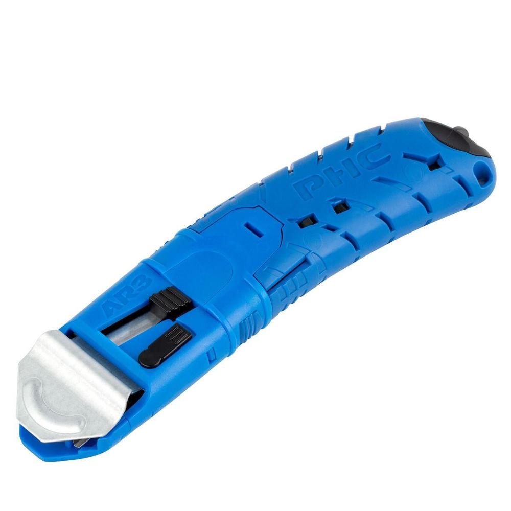 Akční cena je platná do vyprodání zásob. Bezpečnostní nůž PHC AR3 s instalovanou trapézovou čepelí SP-017. Unikátní oboustranný twist a rotační design. Ochranný kryt se může pohybovat s čepelí, aby se minimalizovalo poškození obsahu krabice. Slouží také jako vodítko pro pokaždé dokonalý řez. Čepel lze použít s ochranným krytem nebo i bez něj. Vyroben z plastu. Ergonomická rukojeť. Automatické ovládání čepele pružinou. Otvor pro zavěšení. Snadná výměna čepele bez pomoci dalšího nástroje. Určen pro bezpečné otevírání obalů a řezání materiál.ů Pojme dalších 5 čepelí, které pak máte ihned po ruce. Rozměry 145x38x19mm Váha: 52 g. Instalovaná čepel: Trapézová čepel SP-017 Výměna čepele Stačí pouze vysunout plastovou vložku ven z rukojeti a vyměnit čepel za novou.