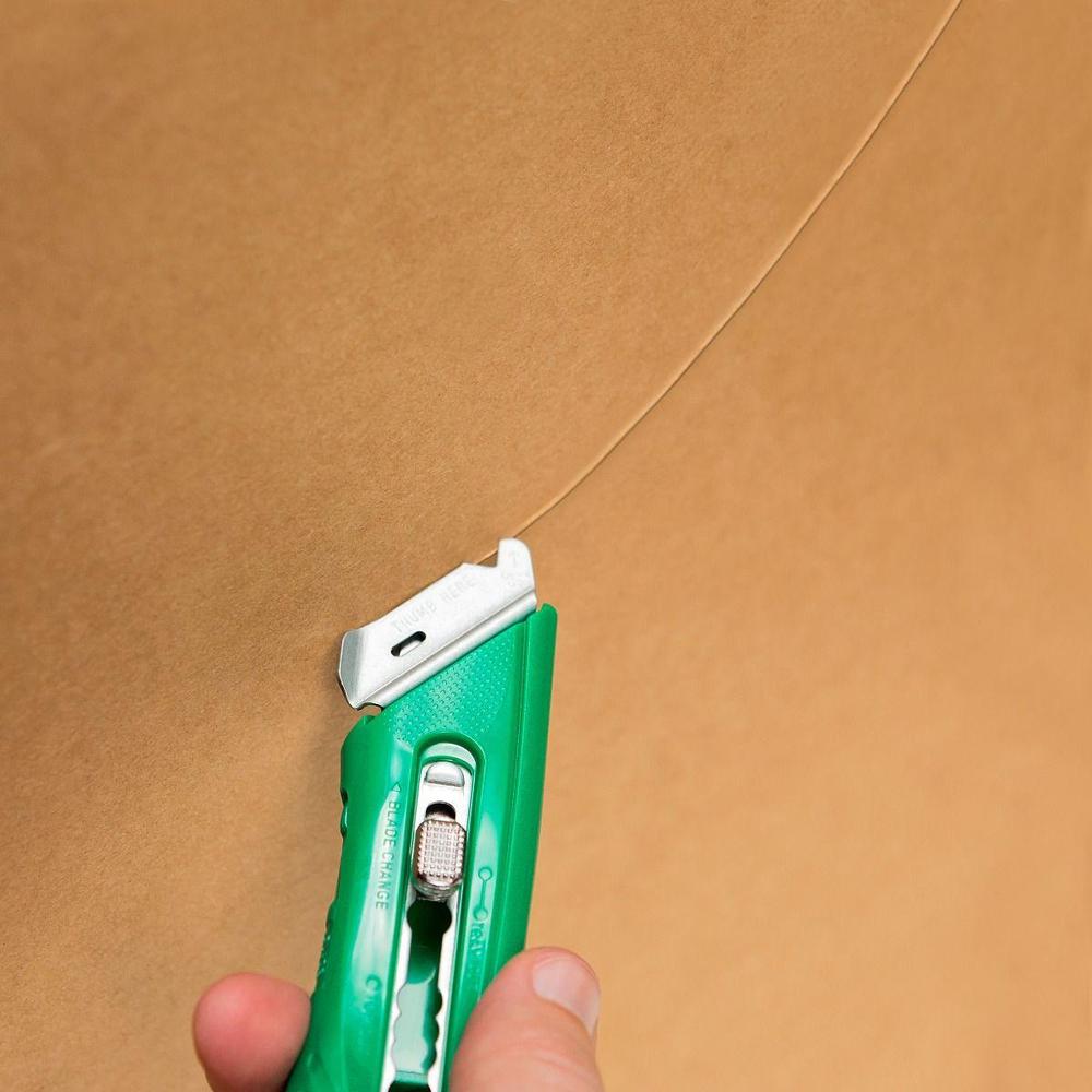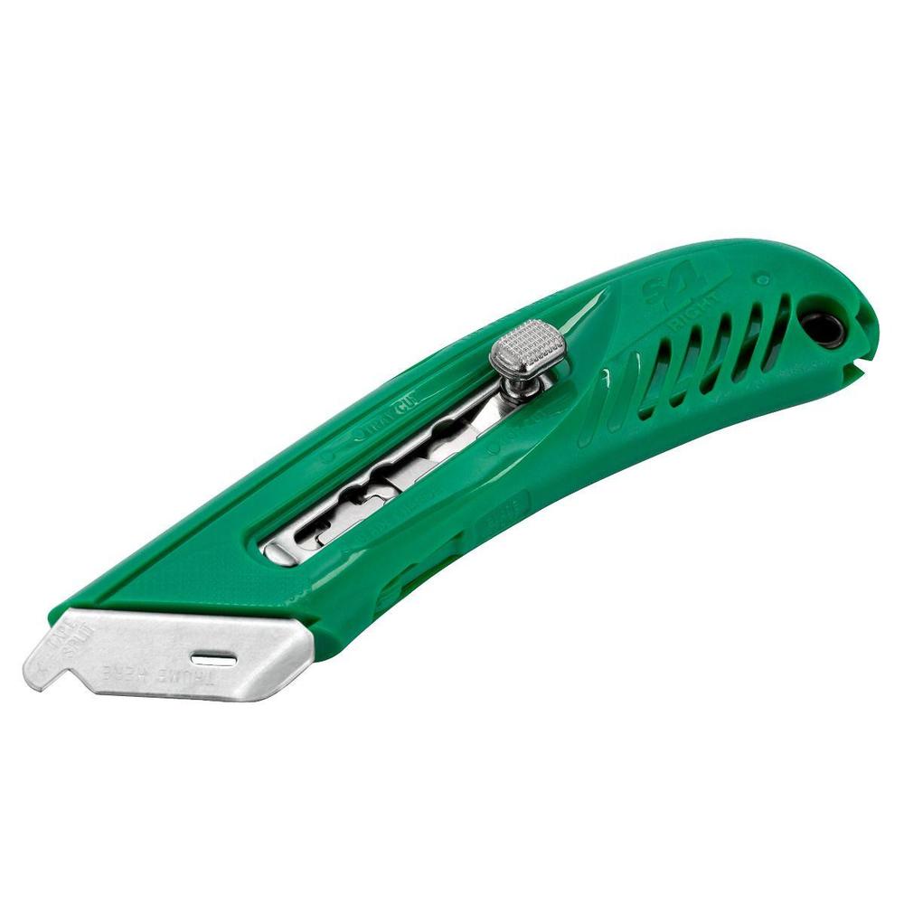 Bezpečnostní nůž PHC S4R s instalovanou trapézovou čepelí SP-017. Vyroben z plastu. Pevný ocelový ochranný kryt, který slouží také jako vodítko pro dokonalý řez. Pohodlný ergonomický design. Pojme dalších 5 čepelí, které pak máte ihned po ruce. Nůž má rozřezávač balicí pásky, který pracuje bez použití čepele. Umožňuje bezpečné, snadné a pohodlné řezání. Unikátní úhel čepele, aby nedošlo k poškození obsahu uvnitř krabice. 3 polohy hloubky čepele - horní řez, mělký řez a hluboký řez. Výměna čepele bez nářadí. Rozměry 146x32x19mm Výměna čepele Dejte ovládací tlačítko co nejvíce to půjde dopředu (k rozřezávači fólií). Stiskněte páčku k uvolnění čepele a zatlačte tlačítko pro posun čepele vpřed. Nyní Vám půjde dát ovládací tlačítko úplně ke kraji. Nazdvihněte čepel z polohovacího výstupku. Vložte novou čepel a umístěte jí podle polohovacího výstupku. Chcete-li vyjmout novou čepel z přihrádky na ukládání čepelí, tak stačí otevřít přihrádku, která se nachází na vrchní části držáku a čepel opatrně palcem posunout dopředu.