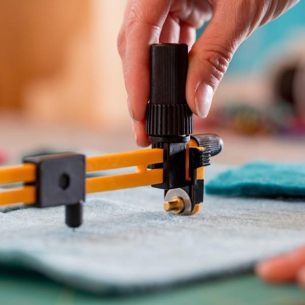 Středné velké kružítko OLFA s rotační řezací čepelí. Ráčnový unašeč pro snadné vykružování. Vhodný pro řezání textilu (patchwork). Maximální průměr řezu 22 cm. Minimální průměr řezu 4 cm. Maximální tloušťka řezaného materiálu cca 3,3 mm. Vhodný pro praváky i pro leváky. Doporučujeme používat v kombinaci s řezacími podložkami - pro maximální výkonnost, prodloužení životnosti ostří a zabránění poškození pracovní plochy. Balení obsahuje čepel RB 18-2 - 1 ks.