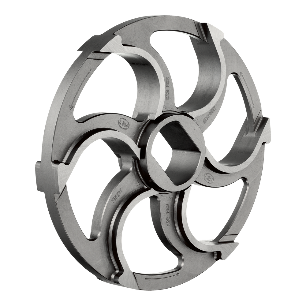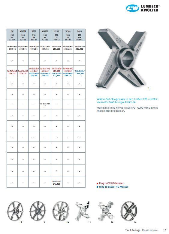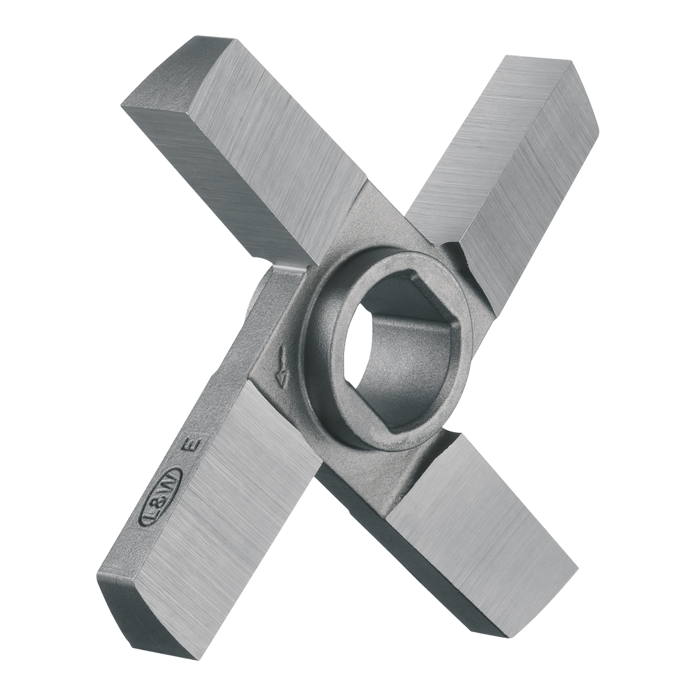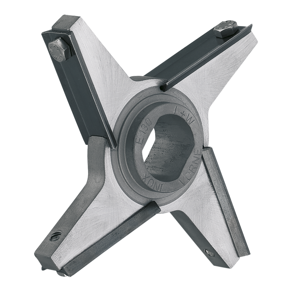 V nabídce jsou různé typy nožů podle konkrétní aplikace, například křížové nože se 4 nebo 6 břity, profilové nože nebo speciální ringové nože, které jsou určeny pro různé konfigurace řezných sad mlýnků na maso.